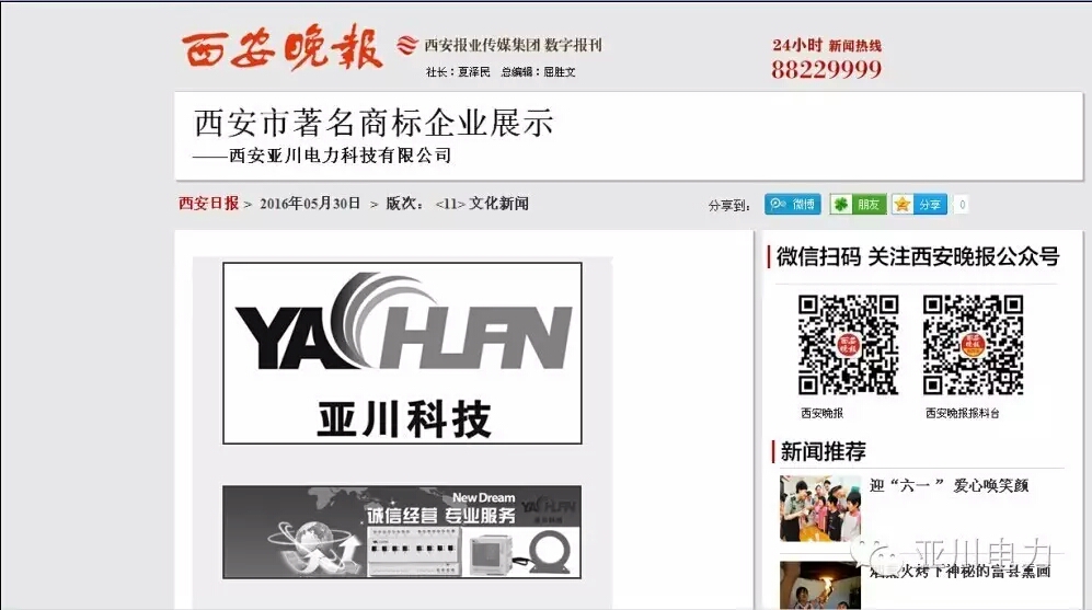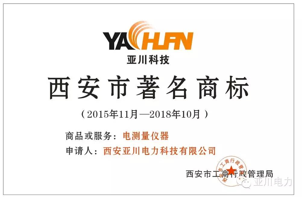 热烈祝贺西安亚川电力荣获“西安市著名商标”称号随着市场经济的日益深入,市场竞争愈加激烈,实施商标战略,对企业的生存和发展越来越凸显它的重要作用。因此,积极争创著...